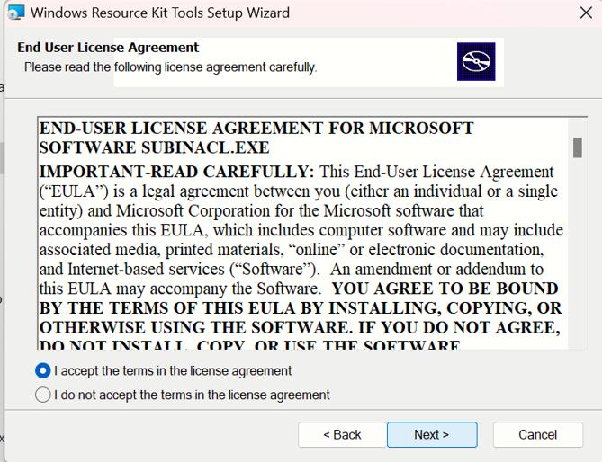 Trin 3:Følg instruktionerne på skærmen i installationsvinduet for at installere SubInACL Tool.