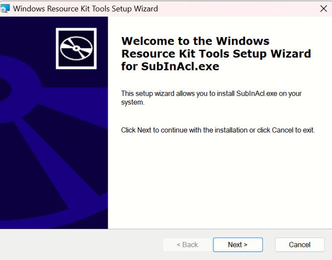 Microsofts websted tilbyder Subinacl-værktøjet til download. Downloaden begynder med det samme, når du indlæser hjemmesiden. Hvis ikke, skal du klikke på linket efter en forsinkelse på 30 sekunder for at downloade det manuelt. Dobbeltklik på installationspakken, efter at den er blevet downloadet. Installationsguiden starter som et resultat. Du kan bruge Subinacl-værktøjet, hvis du ikke er tryg ved at bruge kommandoprompten. Microsoft leverer et kommandolinjeværktøj, der kan bruges til at nulstille brugertilladelser. Sådan gør du: