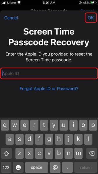 - Din iPhone vil nu bede dig om detIndtast gammel skærmtid adgangskode.Tryk påGlemt adgangskode?for at nulstille den.