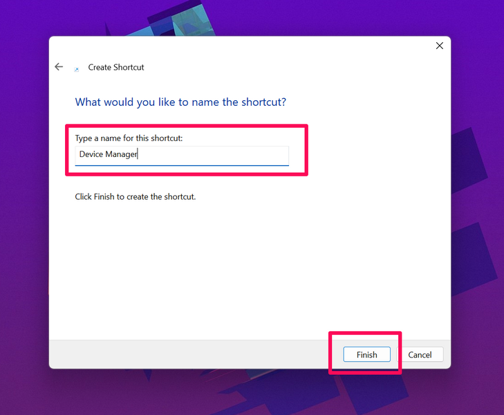 4.I det følgende vindue,angiv et navn til genvejenog klik påSlutteknap. I dette tilfælde har vi navngivet det som "Enhedshåndtering."