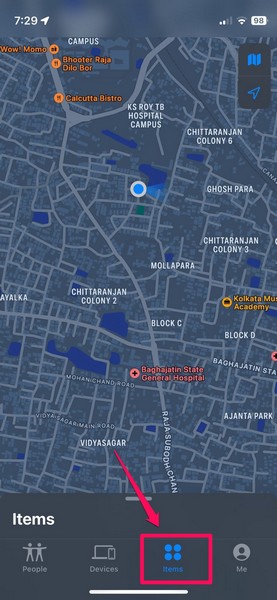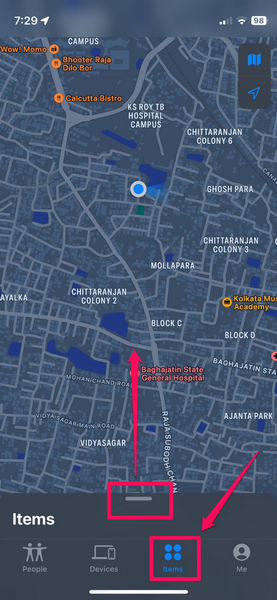 2.I appen skal du trykke påFanen Elementerpå den nederste navigationslinje, og træk vareskuffen op. Du vil finde dine AirTag(s) på denne side.