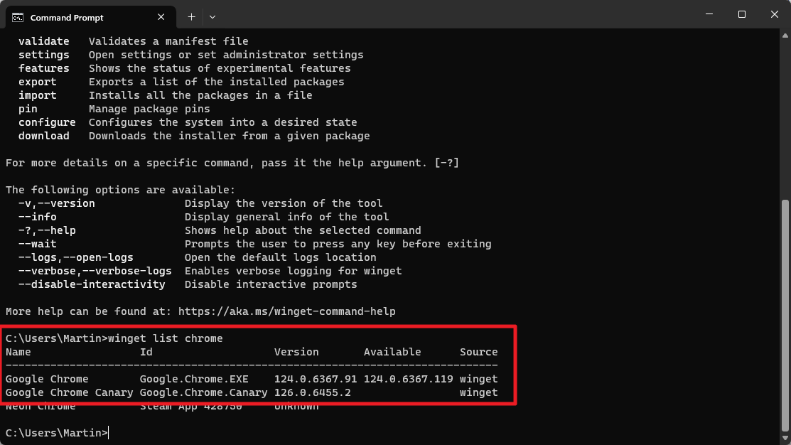 - Winget returnerer alle installerede Chrome-versioner.