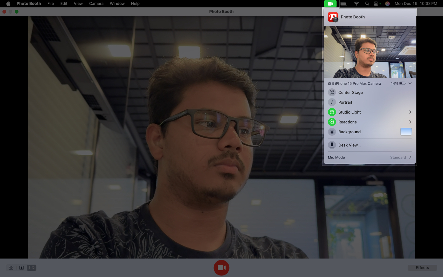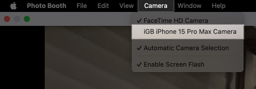 Nu, mens du er i Photo Booth-appen, skal du klikkeKamerai menulinjen, og vælg din iPhone fra listen over enheder for at bruge den.