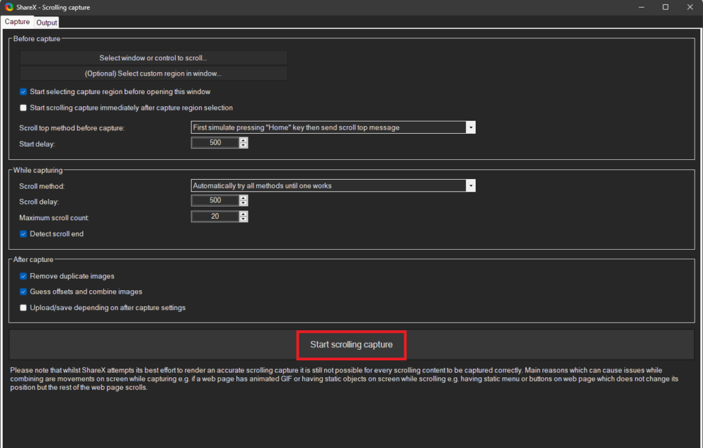 ShareX er et gratis og open source værktøj til at tage skærmbilleder til at rulle skærmbilleder til Windows 11. Det tilbyder en bred vifte af funktioner til at tage rullende skærmbilleder som: