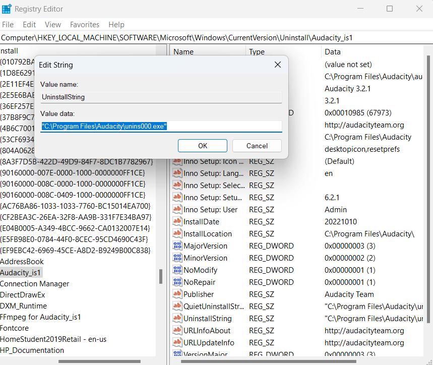 - Find den problematiske app. Når du klikker på den, i højre rude, vil du kunne se en streng kaldetAfinstaller String