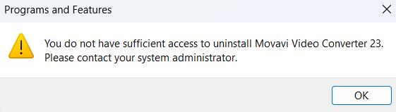 En anden variant af ikke at kunne afinstallere et program er, når det er opført iKontrolpanelmen det viser, at du ikke har administrative tilladelser. Du får muligvis en fejl som vist på skærmbilledet nedenfor -