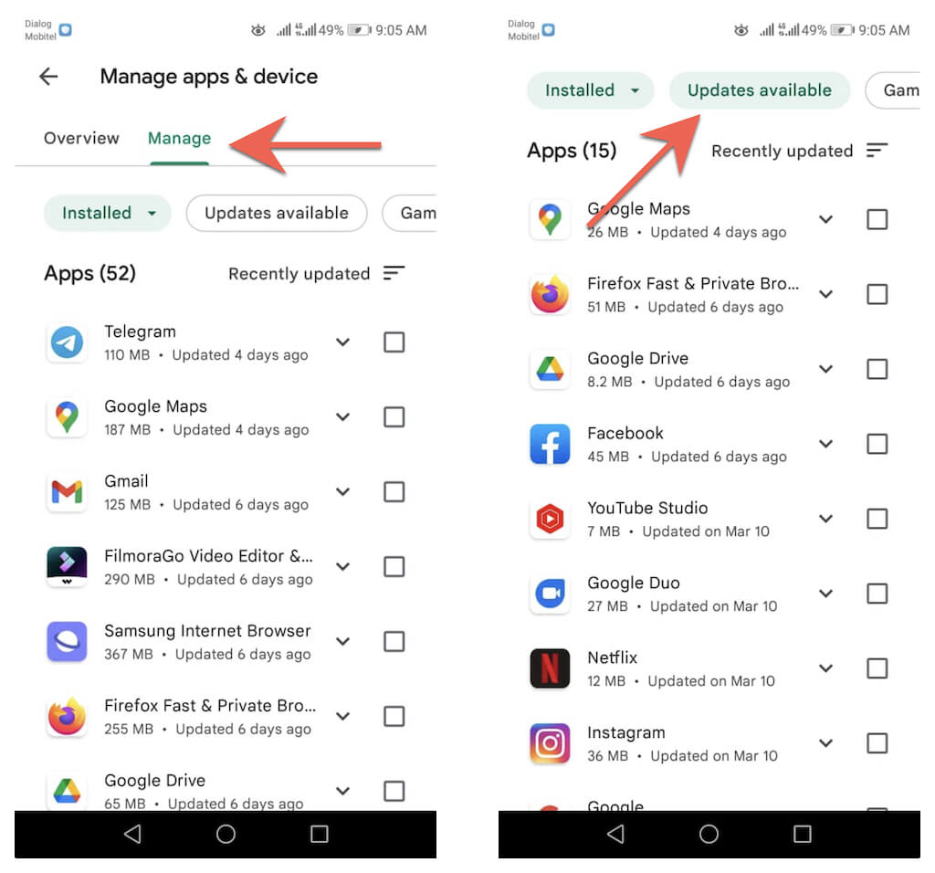 2. Skift tilStyrefanen. Tryk derefter påOpdateringer tilgængeligefor at afsløre en liste over alle tilgængelige opdateringer til din Android-enhed.