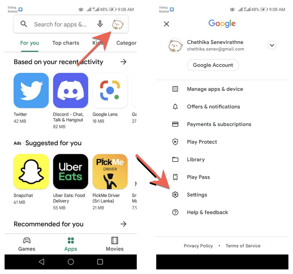 1. Tryk på dit profilportræt øverst til højre i Google Play Butik, og vælgIndstillinger.
