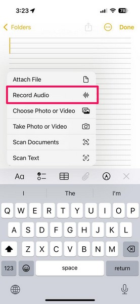 5.På overløbsmenuen skal du trykke påMulighed for optag lydfor at starte en stemmeoptagelse i Notes-appen.