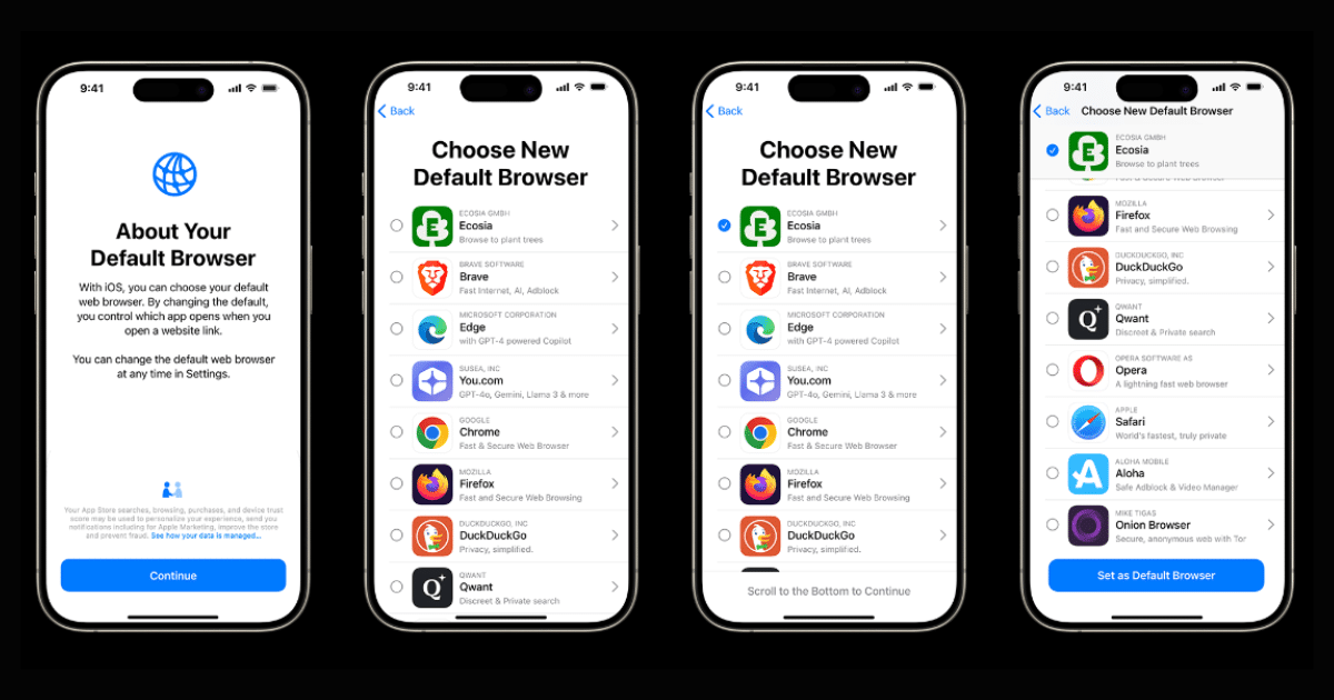 En anden væsentlig opdatering involverer browservalgskærmen. Æbleafsløretat den omdesigner denne skærm for at give mere detaljerede oplysninger om alternative browsere, og den vil blive vist til alle brugere med Safari indstillet som deres standardbrowser. Målet er at gøre det nemmere for brugerne at skifte til en anden browser, hvilket imødekommer bekymringer om, at Apples tidligere design gjorde det udfordrende at flytte væk fra Safari.