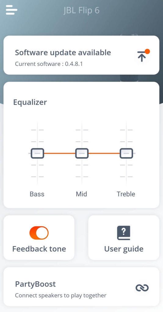 Appen er enkel og brugervenlig, ligesom højtaleren selv. I denEqualizer, du kommer til at justereBas,Midt, ogDiskant. Du kan også bruge appen til at ændre navnet på din Flip 6 til et brugerdefineret navn.