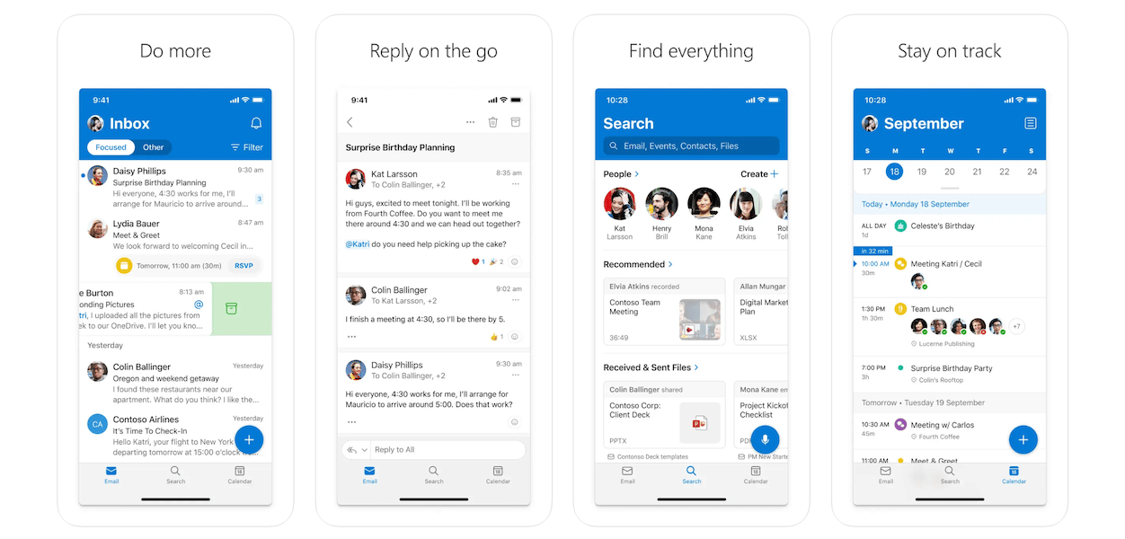 Outlook kombinerer brugernes e-mail-konti og kalendere i en enkelt app, som giver brugerne to muligheder for at organisere deres indbakke: en enkelt indbakke til at vise alle e-mails eller en indbakke med faner opdelt i fokuserede og andre kategorier. Tidligere viste den gratis version af appen kun annoncer i afsnittet "Andet", men nu vises de også i den enkelte indbakke.