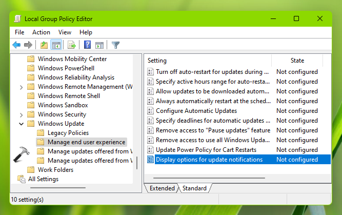Computer configuration > Administrative Templates > Windows Components > Windows Update > Manage end user experience