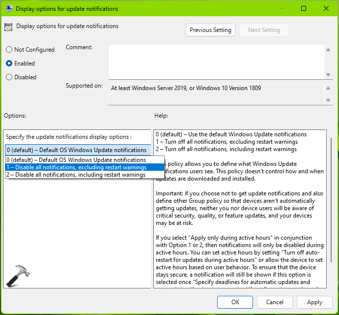 4.I vinduet til politikkonfiguration skal du vælgeAktiveret. Derefter kan du under Angiv visningsindstillingerne for opdateringsmeddelelser bruge rullemenuen til at vælge en relevant mulighed for dig. Klik på Anvend, OK.
