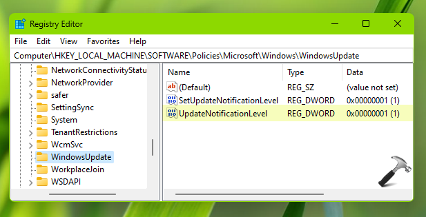 3.I højre rude af WindowsUpdate skal du oprette og indstilleUpdateNotificationLevelregistreringsdatabasen DWORD og indstil det følgende numeriske værdier afhængigt af den ønskede indstilling: