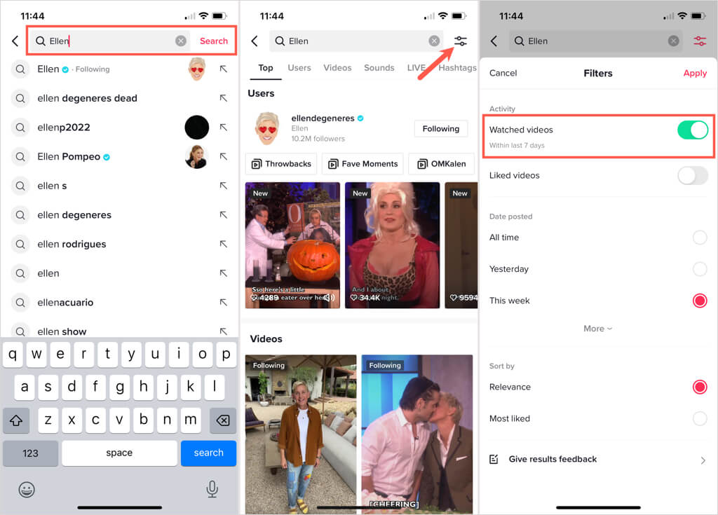 Hvis du vil have en hurtig og nem måde at se en bestemt video i din afspilningshistorik, kan du gøre det ved at bruge TikTok-søgefilterfunktionen i mobilappen.