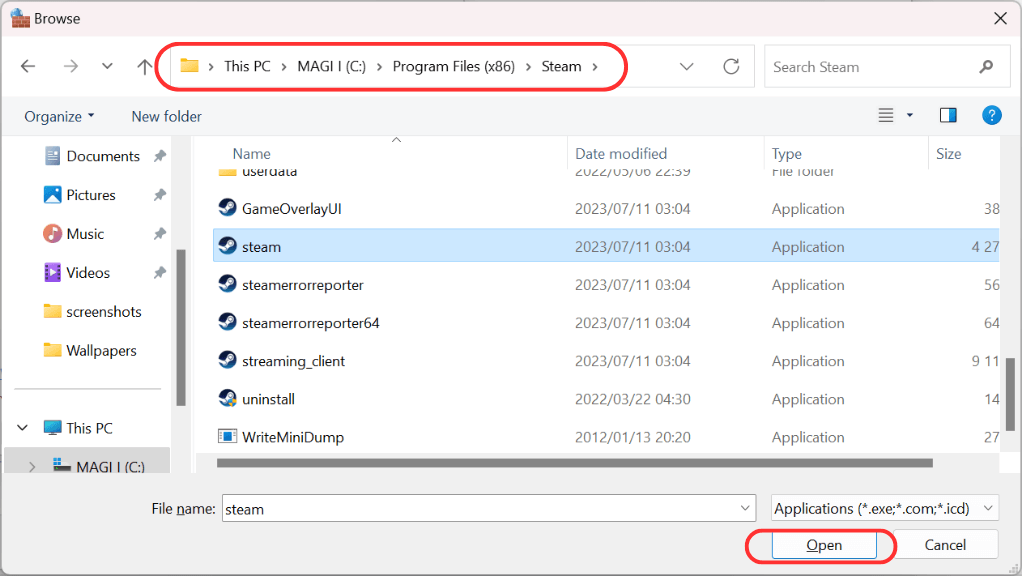 - FremhævSteam.exeog vælg derefterÅben.