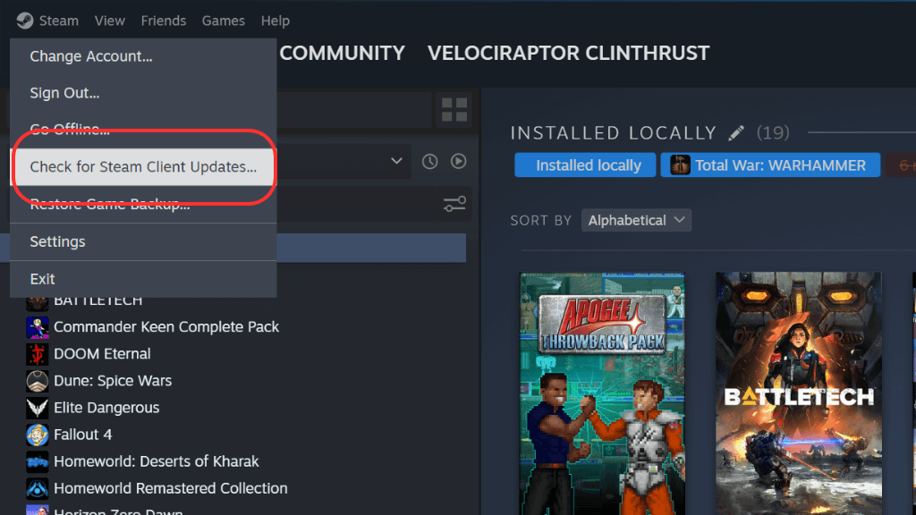 Nogle gange kan opdatering af din Steam-klient løse problemet. For at søge efter opdateringer skal du åbne Steam og klikkeDampi øverste venstre hjørne, altsåSe efter Steam-klientopdateringer. Hvis en opdatering er tilgængelig, skal du installere den og prøve at oprette forbindelse igen.