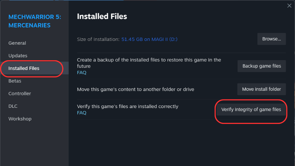 For at gøre dette skal du åbne Steam-klienten og gå til dit bibliotek—Højreklik på spilletforårsager problemer og vælgEgenskaber. I det vindue, der vises, skal du klikke påInstallerede filerfanen ogBekræft integriteten af spilfilerne.