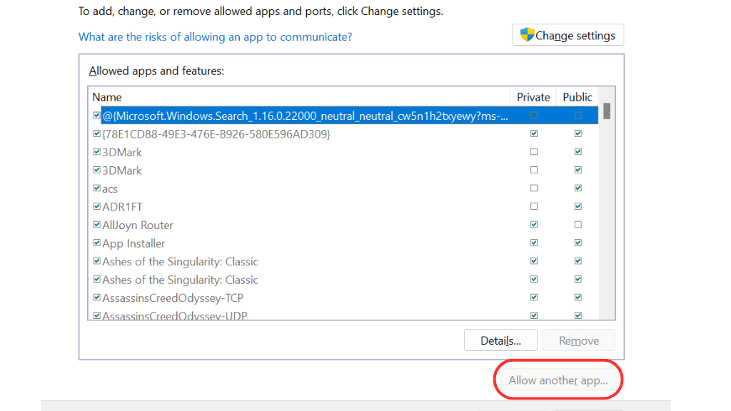 - Se efter Steam på listen over tilladte apps og funktioner. Hvis det ikke er der, skal du klikkeSkift indstillinger,
