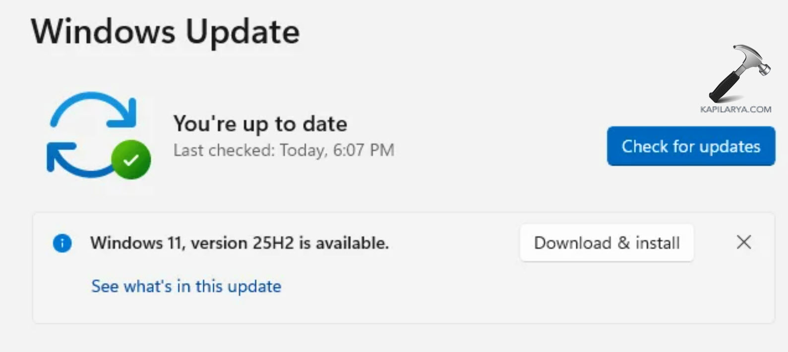 Når du går til Windows Update-siden, skal du have Windows 11, Version 25H2 er tilgængeligt banner. Klik på knappen Download og installer, og opdateringen vil blive installeret. Hvis banneret stadig mangler, skal du sørge for at få de seneste opdateringer slået til, så snart de er tilgængelige.