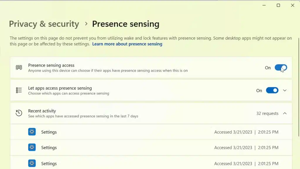 Brugere vil være i stand til at kontrollere, hvilke apps der registrerer deres tilstedeværelse i området for privatlivsindstillinger i WindowsIndstillingerapp, som kan tilgås påIndstillinger>Privatliv og sikkerhed>Tilstedeværelsesføling. Herfra kan brugere skifte, hvilke apps der har adgang individuelt eller slå funktionen helt fra.