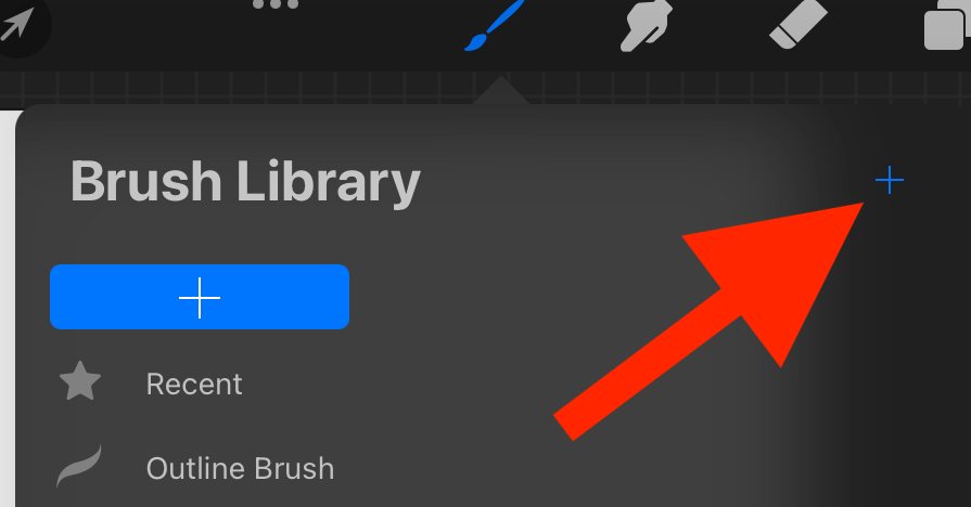 Trin 1:Åbn dit penselbibliotek ved at trykke på penselikonet i øverste højre hjørne af dit lærred. I rullemenuen penselbibliotek skal du trykke på +-symbolet iøverste højre hjørne.