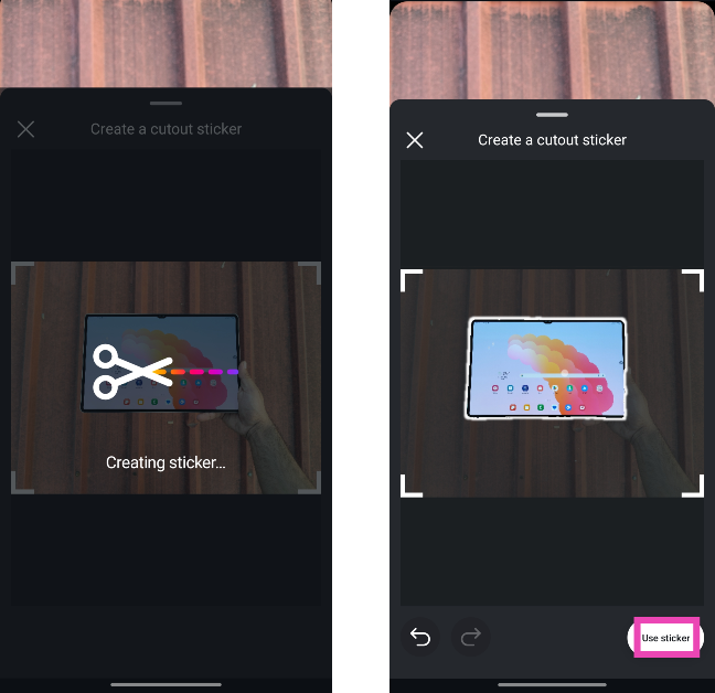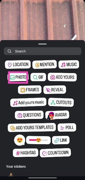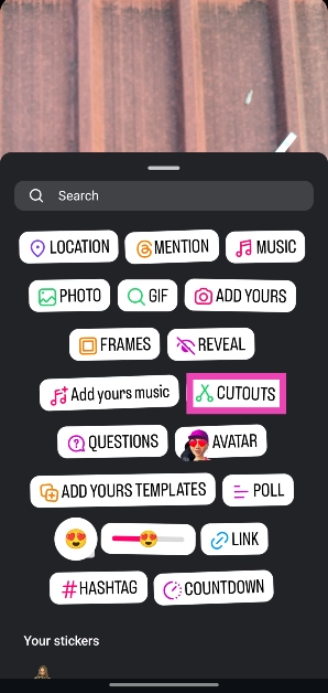 Du kan lag billeder på din Instagram-historie ved at bruge klistermærkerne 'Fotos' eller 'Udskæringer'. Førstnævnte poster hele billedet som et lag på baggrundsbilledet, mens sidstnævnte udtrækker motivet fra billedet og sætter det som et klistermærke på baggrundsbilledet.