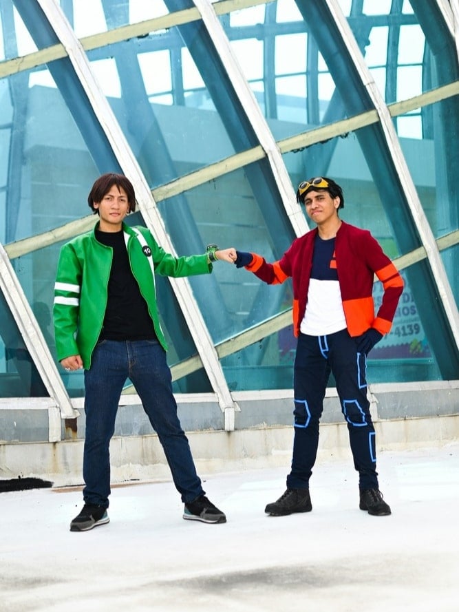 Tag de to mænd og placer dem i de nøjagtige stillinger som manden i grønt, der bærer manden i rødt. Bevar deres identiteter, kropsproportioner og tøjdetaljer. Sørg for, at stillingen er naturlig og realistisk med ensartet belysning, skygger og perspektiv. Fotorealistisk resultat i høj opløsning.
