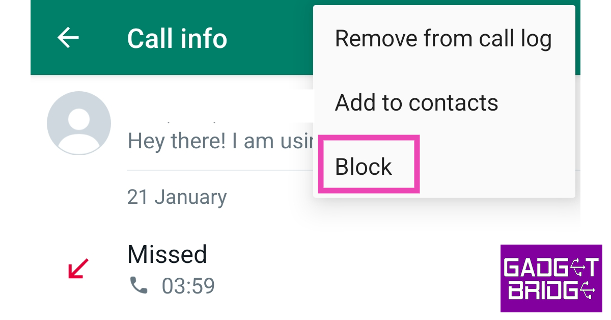 Hvis du konstant modtager opkald fra ét ukendt nummer, vil blokering af den, der ringer, forhindre dem i at kontakte dig. Når nummeret er blevet spærret, vil du ikke modtage opkald eller beskeder fra dem. Når en opkalder er blokeret, vises deres beskeder om ubesvarede opkald ikke på fanen opkald i WhatsApp. Tryk på det ukendte nummer i din opkaldslog, og vælg 'Bloker' fra listen over muligheder.