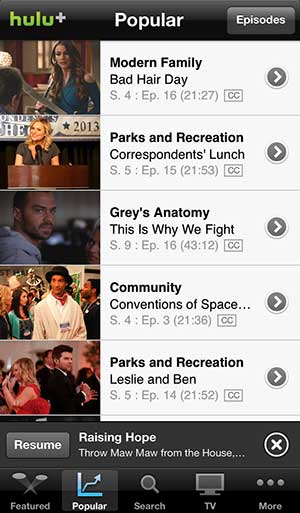 Hulu Plus iPhone 5 appHulu Plus er mere fokuseret på at tilbyde seneste episoder af populære tv-programmer, mens Netflix tilbyder film og tidligere sæsoner af tv-shows.