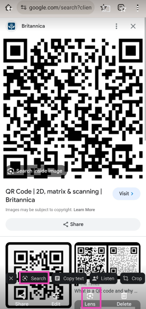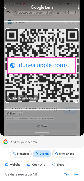 Trin 5:Google Lens vilscan QR-kodenog præsentereresultat.