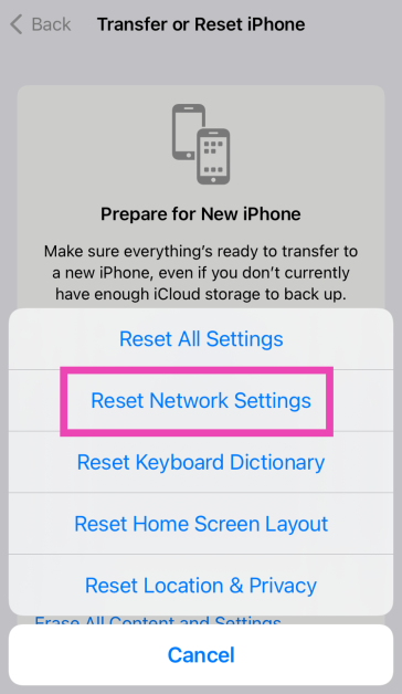 Gå tilIndstillinger>Generelt>Overfør eller nulstil enhed>Nulstilog tryk på 'Nulstil netværksindstillinger'. Dette vil indstille alle dine tilpassede netværksindstillinger til deres fabriksindstillinger. Alle de tilsluttede enheder og netværk vil blive afparret og glemt af din iPhone.