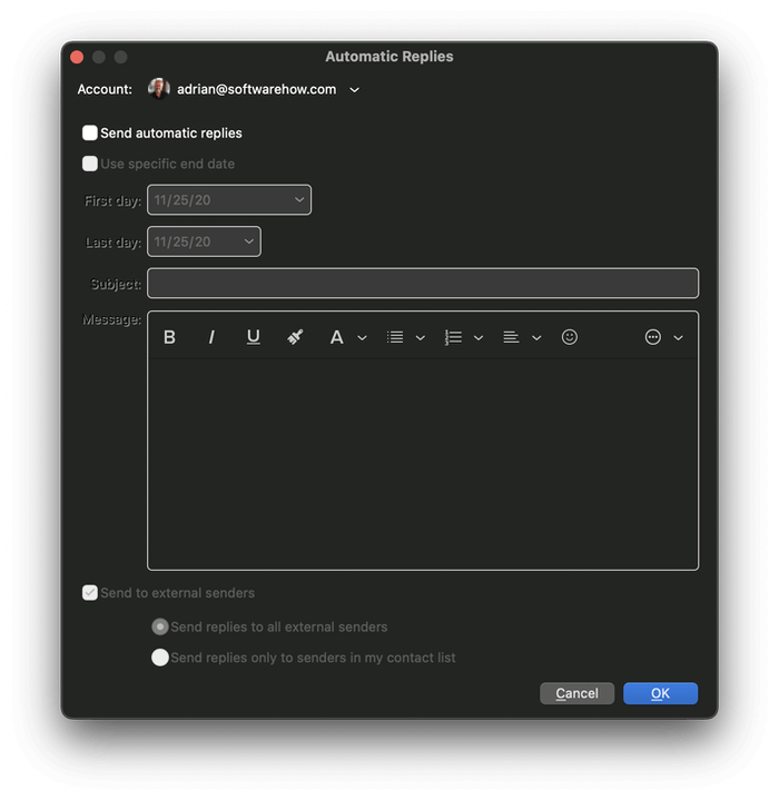 Du kan vælge, hvornår svar og nye e-mails sendes vhaSend senere. Vælg blot den ønskede dato og klokkeslæt fra et pop op-vindue.