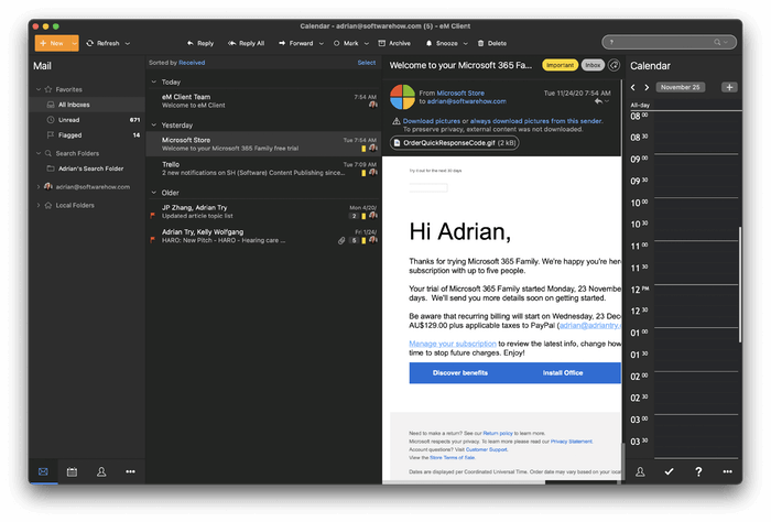 eM klienter et moderne, attraktivt program til Mac og Windows med et fantasiløst navn. Det tilbyder tonsvis af funktioner, der vil fremskynde din arbejdsgang og hjælpe dig med at organisere din e-mail. Appen indeholder produktivitetsværktøjer såsom en kalender, opgavehåndtering og mere.