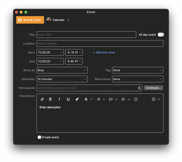 De fungerer godt, men vil ikke konkurrere med førende produktivitetssoftware. For eksempel kan du oprette tilbagevendende aftaler, se alle e-mails, der tilhører en kontakt, og indstille påmindelser. De forbinder med en række eksterne tjenester, herunder iCloud, Google Kalender og andre internetkalendere, der understøtter CalDAV. Møder og opgaver kan hurtigt oprettes ved at højreklikke på en besked.