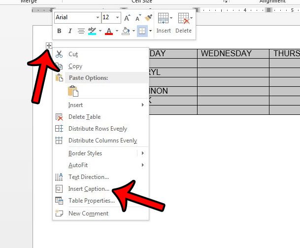 Trin 3: Højreklik på ikonet øverst til venstre i tabellen med de fire retningspile, og klik derefter påIndsæt billedtekstvalgmulighed.