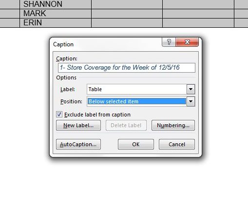Trin 4: Indtast den ønskede billedtekst iBilledtekstfeltet, og foretag derefter de ønskede ændringer i formateringen af billedteksten. For eksempel kan du tjekkeUdelad etiket fra billedtekstmulighed, hvis du ikke ønsker, at standardteksten "Tabel" skal vises, eller du kan klikke påPositionrullemenuen og vælg at sætte billedteksten under bordet. Når du er færdig, skal du klikke påOKknap.
