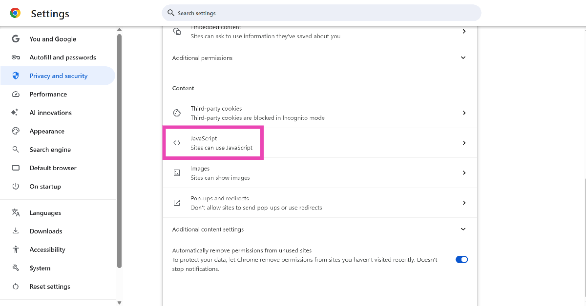 Trin 3:VælgePrivatliv og sikkerhedfra sidebjælken og gå tilIndstillinger for websted.