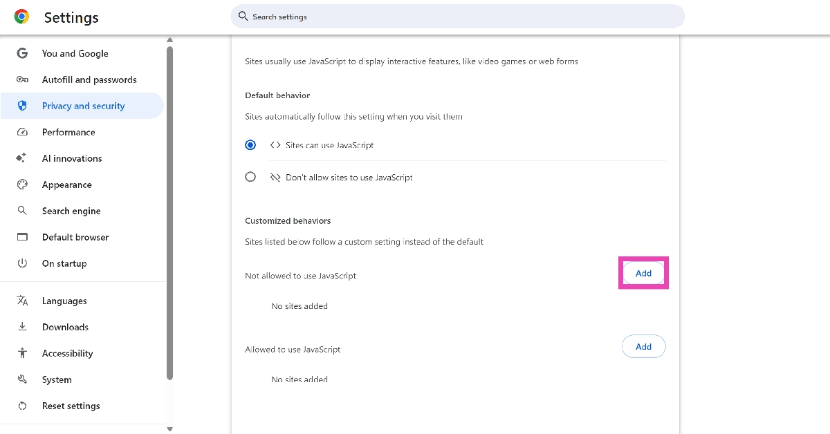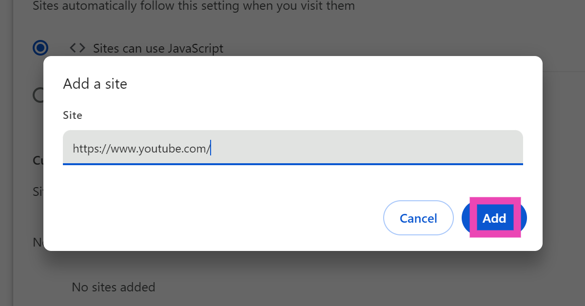 Trin 5:Tryk påTilføjeknappen ved siden afIkke tilladt at bruge JavaScript.