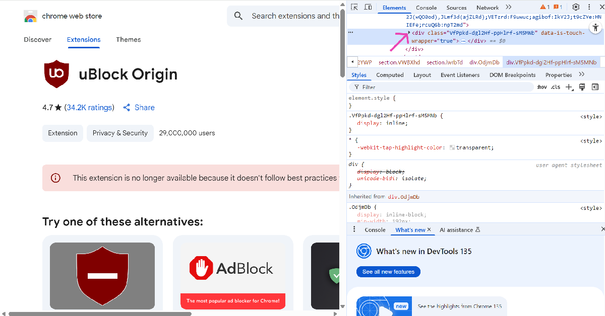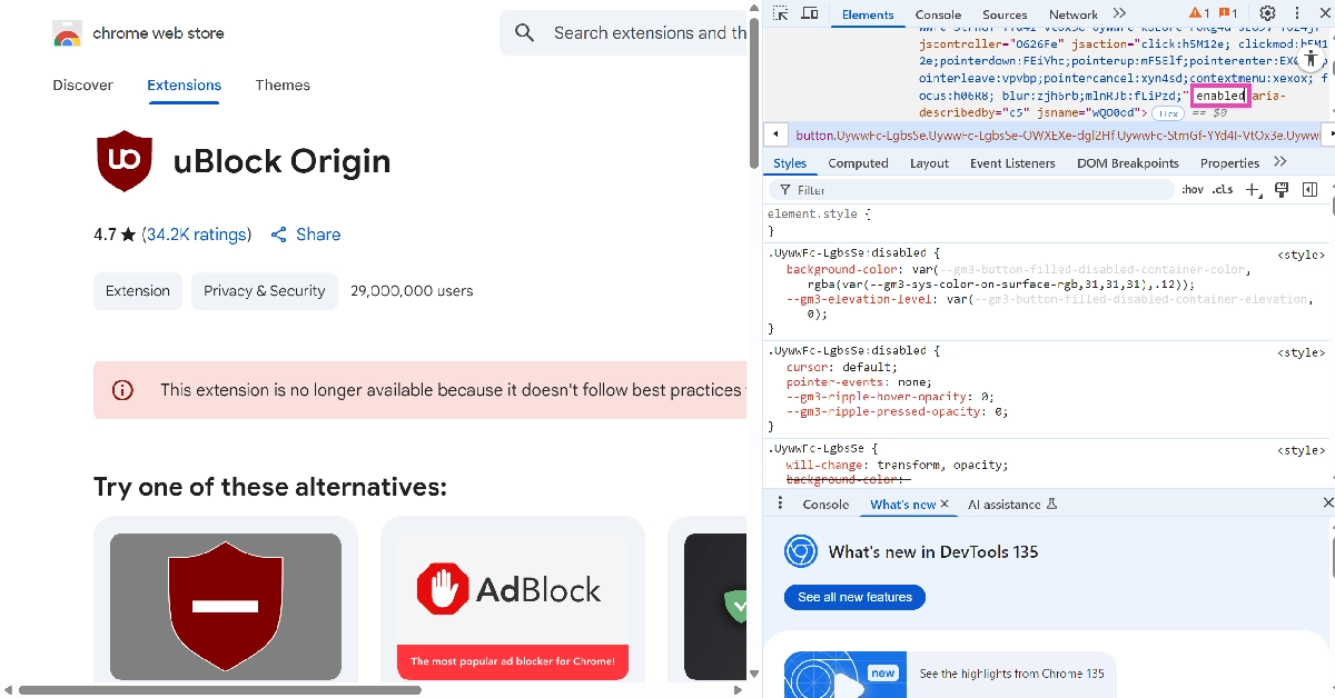 Ublock Origin-udvidelsen fungerer stadig på Chrome. Det er dog afnoteret i Chrome Webshop. Du kan downloade den ved at højreklikke på den gråtonede 'Tilføj til Chrome'-knap, udvide den fremhævede tekst og erstatte 'handicappet aria-beskrevetaf' med 'aktiveret aria-beskrevet af’.