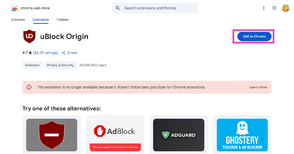 Trin 1:Gå tilUbloker Origins sidepåChrome Web Store.
