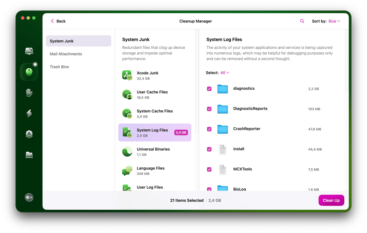 Det er så nemt som muligt at rydde op i logfiler med CleanMyMac. Og som vi sagde før, den kan også så meget mere! Med CleanMyMac kan du rydde op i forældede apps, sprogpakker, universelle binære filer og gigabyte af ubrugeligt skrammel, som du ikke engang vidste, du havde. Download CleanMyMac nu og føl, hvordan det er at have en hurtigere og renere Mac.