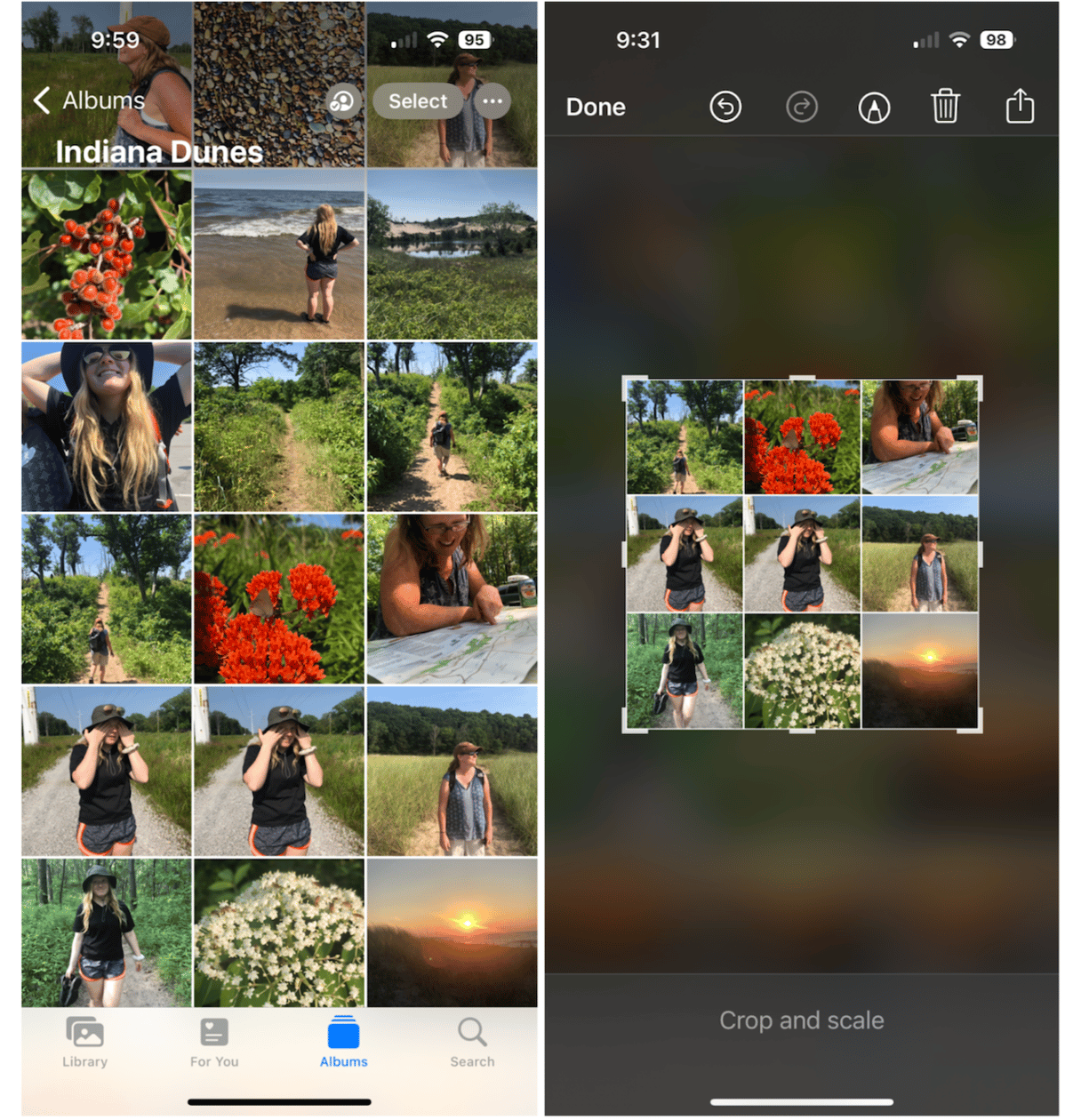 - Åbn dit skærmbillede i Fotos-appen. Tryk på 'Rediger' > 'Beskær' og træk beskæringslinjerne for at inkludere de billeder, du ønsker i din collage, uanset om det er to eller ni.