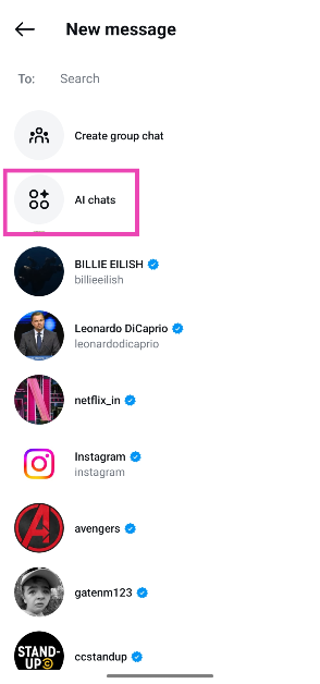 Gå til dine Instagram DM'er, tryk på blyantikonet i øverste højre hjørne af skærmen, vælg AI Chats, og vælg en AI-karakter fra listen.