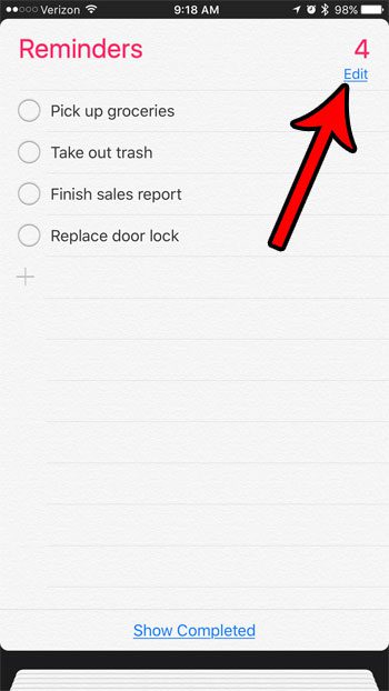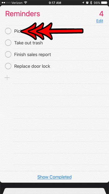 Trinnene i denne artikel blev udført på en iPhone 7 Plus i iOS 10.3.3. Der er faktisk to forskellige måder, hvorpå du kan slette en påmindelse i appen Påmindelser, og vi viser dig begge disse muligheder nedenfor. Uanset hvilken metode du vælger at bruge er op til dig.