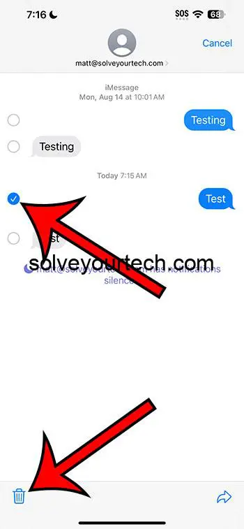 Trin 5: Tryk på cirklen til venstre for de beskeder, du ønsker at slette, og tryk derefter på skraldespandsikonet nederst på skærmen.
