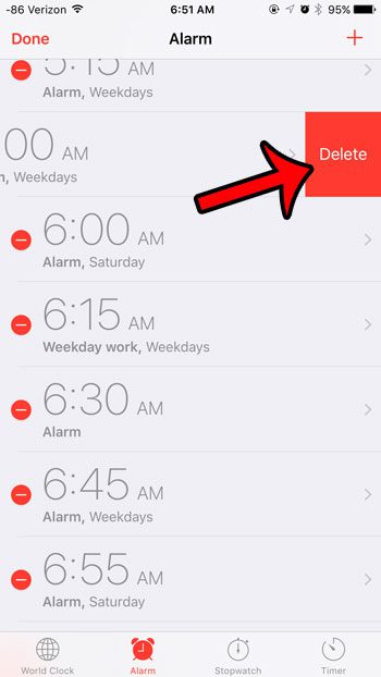 Men konstant brug af Alarm-indstillingen på Ur-appen kan efterlade dig med en masse forskellige alarmer, så du måske i sidste ende ønsker at slette nogle af dem.