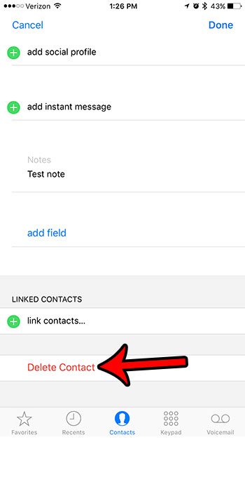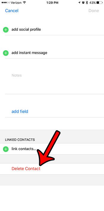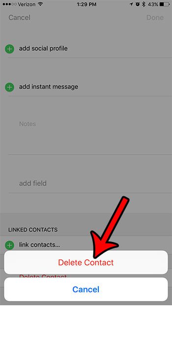 Trin 4: Stryg til bunden af denne menu, og tryk derefter på den rødeSlet kontaktknap.