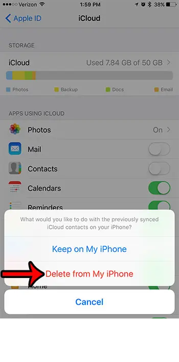 Trin 6: Tryk på den rødeSlet fra min iPhoneknappen for at fjerne disse kontakter fra din enhed.